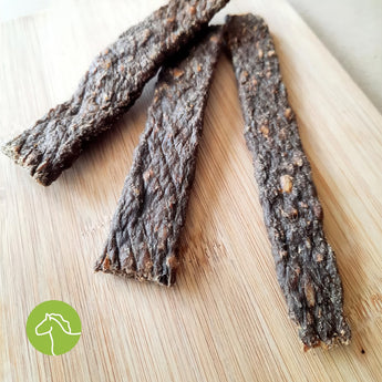 Die schonend luftgetrockneten Pferdefleischstreifen bieten einen hypoallergenen, naturbelassenen Kausnack für Hunde. Aufgrund des Monoproteins ist das Pferdefleisch besonders gut verträglich und eignet sich daher hervorragend für Hunde mit Allergien oder Unverträglichkeiten. Der schonende Trocknungsprozess bewahrt die natürlichen Nährstoffe und ein intensives Aroma.